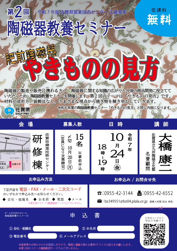 申込先 | 佐賀県窯業技術センター窯業人材課(有田町大野乙2441-1) TEL:0955-42-3144 FAX:0955-42-6552 E-mail:yougyougijutsusenta@pref.saga.lg.jp 担当:長尾 |